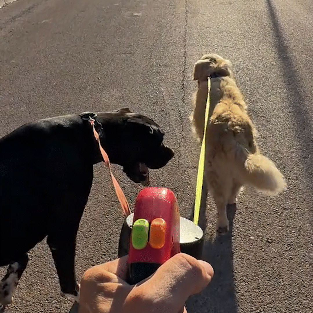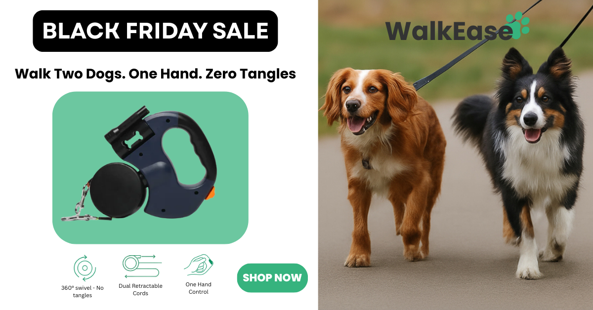 Meet the WalkEase duo dog leash, the smarter way to walk two dogs at once. Its dual retractable cords and swivel mechanism prevent twisting, while colour-coded controls let you guide each pup separately.